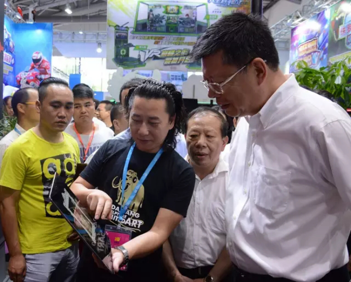 開幕式一結束,中山市各個領導就在中國文化娛樂行業協會執行會長劉金華、中山市文化廣電新聞出版局局長羅建華、廣東游戲游藝文化產業城總裁葉威棠等的帶領下移步前往展廳參觀。